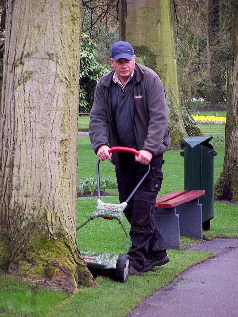 Manicuring the lawn at Keukenhof Gardens, Lisse, Netherlands