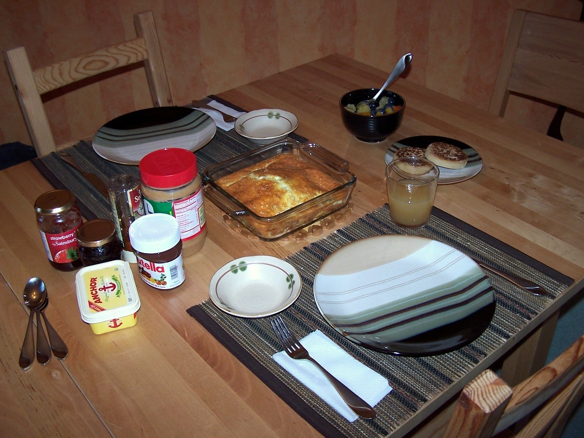 Here’s an unusual sight for a Monday morning. Rarely is there a hot breakfast on my table. I’ve normally got a bowl of cereal or some toast in my lap while I’m sitting in front of the computer (an accident waiting to happen, I know). But I’ve got company this week, and I thought a considerate host should provide a more substantial breakfast for her guest (staying in so many B&Bs around the UK has rubbed off on me). So I pulled out all the stops, serving up my mom’s sausage and egg casserole recipe, some hot, toasted crumpets, and a bowl of fresh fruit. Tomorrow’s menu consists of today’s leftovers or a bowl of cereal. 🙂