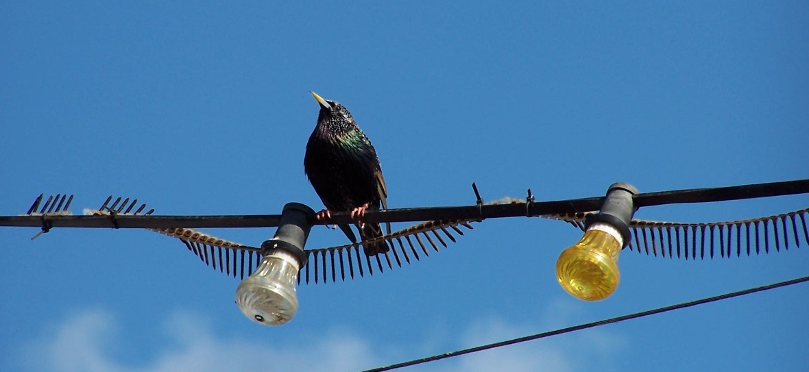 Bird on a wire, high above the streets of Volendam, The Netherlands
