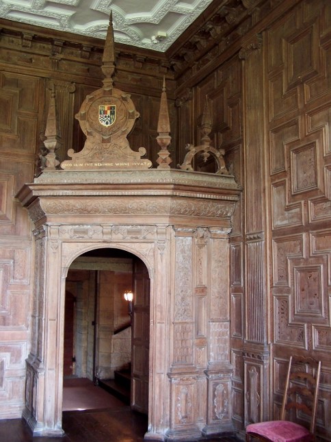 Elaborately carved paneling in the 14th century Oak Room of Broughton Castle, Banbury, England.