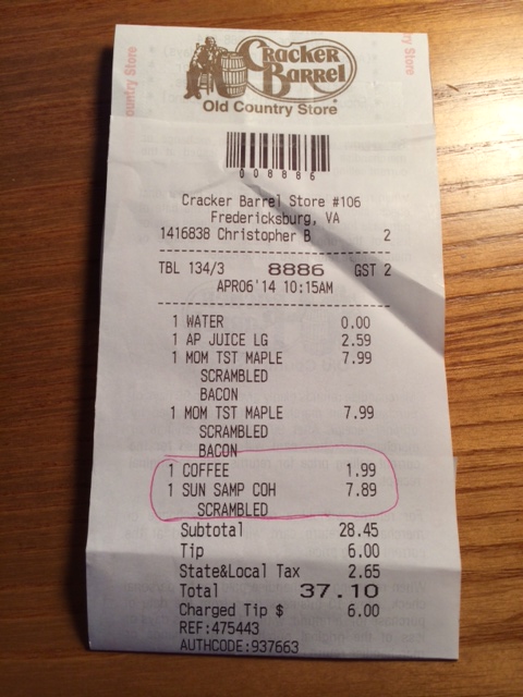Well, Sunday came, the race was run (run, not walked…yay, me!), and French toast ensued. Cracker Barrel was filled to bursting, but nowhere in the entire restaurant could I find the cute older couple I had envisioned. So then I switched gears and began looking around for someone(s) who might be voted “least likely to have a stranger buy his (their) breakfast.” Bypassing the lovely family of eight at the big round table in the corner (I did set myself a budget for this month-long project), I spied a 30-something guy dining alone. Judging the book solely by its cover, I didn’t figure many people would voluntarily step up to do something kind for him..in fact, I rather felt like most would have crossed to the other side of the street if he’d been approaching on the sidewalk. I suspected that his build, choice of clothing, and number of visible tattoos would have immediately roused in the average Joe unease, distrust, and judgmental speculation about his personality and/or behavior. Unless some sixth sense is screaming at me, I tend to believe that everyone around me is inherently good, and I work under that assumption until they prove otherwise. No warning bells went off as I surreptitiously observed this guy’s interaction with his waiter, and I was convinced he was the one I wanted to treat to breakfast.