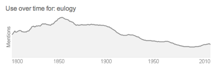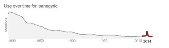 I heard “panegyric” spoken aloud for the first time Monday night. Unfortunately, it was spoken in the final round of a grown-up spelling bee in which two teammates and I were participating for charity. None of the three of us had ever heard the word. No wonder, looking at its rate of usage since 1800.